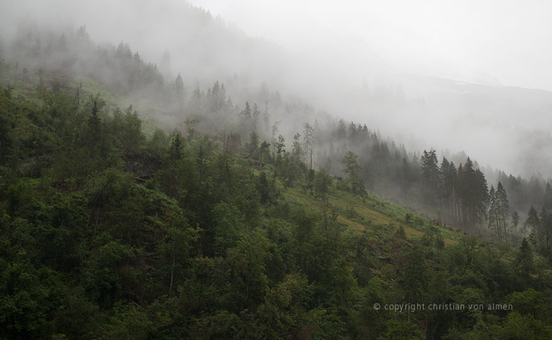 In diesen „Charme“ ist auch ein wenig Schwermut hineingewoben, gepaart mit meinem Pragmatismus im Umgang mit den Wettergewalten. Was kann denn ich gegenüber diesen Naturkräften ausrichten? Letztendlich bleibt da immer nur ein Staunen und Fürchten übrig; ob den Schönheiten, ob den zerstörerischen, chaotischen Kräften. Der jahrhundertlange, zuweilen fast übermenschlich harte Überlebenskampf mit den Elementen ist noch heute, wenn auch bei den meiste wohl eher unbewusst, Teil unserer Bergleridentität. Nicht umsonst waren zum Beispiel die Walser die fast immer zuhinterst und zuoberst in den Bergtälern siedelten in ganz Europa gefragte und gefürchtete Söldner. Es ist darum naheliegend, dass die Allmächtigkeit der Natur bei unseren Vorfahren ein fruchtbarer Boden für allerlei Aberglauben fand. Selbst wenn die Wetterenergien mittlerweile erforscht und wissenschaftlich erklärt sind, wirken sie nicht weniger auf Gemüt und Seele.