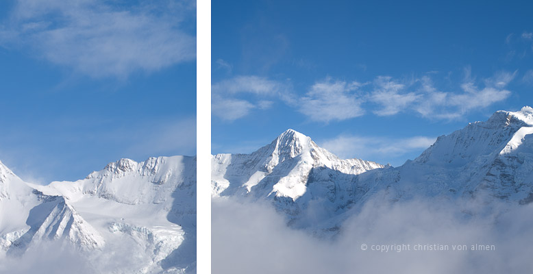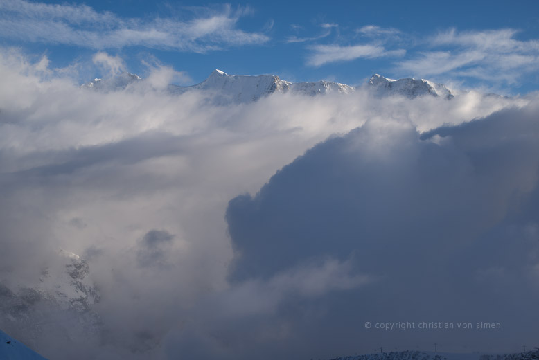Doch glücklicherweise habe ich noch einen Joker im Ärmel. Kurz entschlossen besteige ich die nächsten Kabine Richtung Schilthorn, lasse ein weiteres Mal die graue Tristesse hinter mir, schwebe schon bald umgeben von dem kalten, hellweissen Blau des Winterlichts gipfelwärts. Einsam steht der Mond, in seinem ersten Viertel, zwischen Cirruswolken am Himmel.
