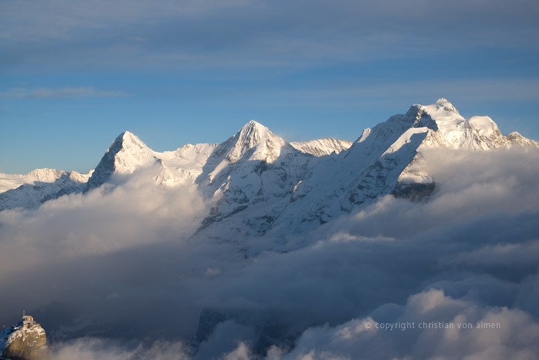 Oben angekommen warte ich im Restaurant den späten Nachmittag ab, führe mein Fototagebuch nach und hoffe, dass der Nebel wieder sinken möge. Und tatsächlich, die Geduld zahlt sich aus. Die Wolkendecke reisst auf. Die letzten Sonnenstrahlen beleuchten das Birg. Wie spielzeugklein wirkt doch das Stationsgebäude gegenüber den drei mächtigen Riesen im Hintergrund.