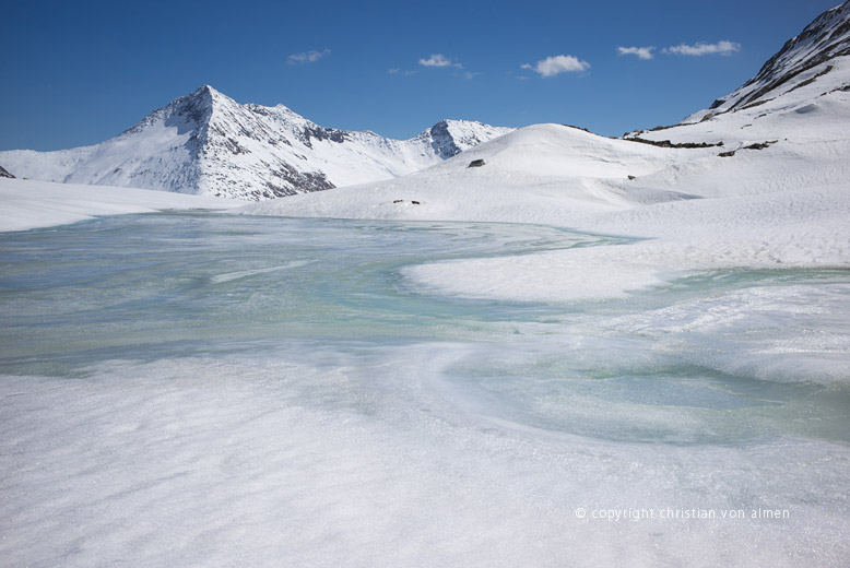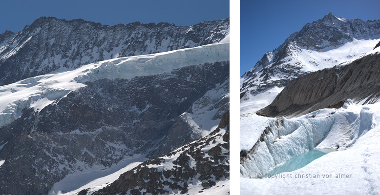 Geradeaus, in Fahrtrichtung, noch in beträchtlicher Ferne erhebt sich das Eggishorn. Der Nordgrat scharf wie ein Schiffsbug. Er teilt den Gletscher, der längste der Alpen, in zwei Arme auf. Doch derjenige nach Fisch hinunter ist seit Menschengedenken abgeschmolzen. In den vergangenen rund 150 Jahren hat auch der Hauptstrom fast zwei Drittel seines Eisvolumens eingebüsst. Heute verkümmert er zusehends und verkriecht sich immer mehr in den schattigen Tiefen der Massaschlucht. Ob dieses Gedankens habe ich das Ende der oberen Plateauebene erreicht. Vor mir spaltet sich nun der Gletscher, an einer Geländestufe, in gutmütige Schründe auf. Fertig also mit „crusing along“. Jetzt ist erhöhte Aufmerksamkeit gefordert. Auch ist es wärmer geworden und in der Nähe der ausgeschmolzenen Steine und Geröllrippen heisst es, wegen der Hohlräume, gut aufzupassen. Ein äusserst reizvoller Kontrast zum Gletscherweiss bilden die türkisblauen Schmelzwasserseelein.