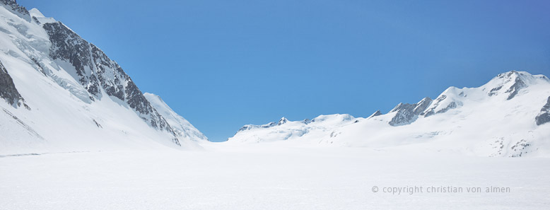 Eine kleine Ewigkeit dauert es bis der Konkordiaplatz, dessen Distanzen nicht ganz einfach zu schätzen sind, hinter mir zurück bleibt. So mühelos und genussvoll wie heute gelingt die Durchquerung nicht immer. Komme mir wie in einem fahrenden Zug am Fensterplatz sitzend vor. Mit mässigem Tempo gleite ich auf meinen Skiern dahin. Schaue mal links dann wieder rechts und wieder links, so wie es mir gerade beliebt. Ab und zu werfe ich einen aufmerksamen, wachsamen Blick nach vorne. Doch der Gletscher liegt spaltenlos, gut verschneit, mit kompakt tragender Oberfläche vor mir, wie ein weisser ausgerollter Teppich.