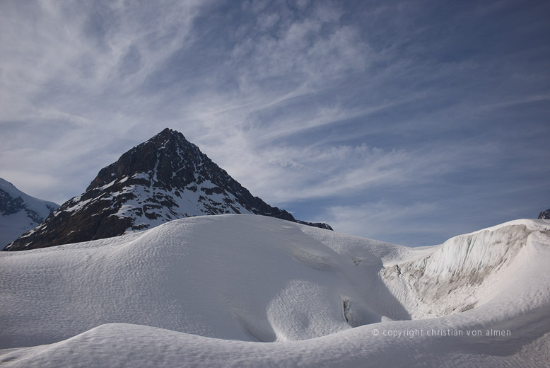 Ich erinnere mich – ganz am Anfang meiner Bergfahrten – wie ich zum ersten Mal das Jungfraujoch bestiegen habe. So einfach mit der Bahn hochfahren kam für mich nicht in Frage. Den Erstbesteigern der Jungfrau wollte ich es gleichtun. Nach langem, beschwerlichen Anmarsch, so wie früher im Himalaya von Katmandu zu einem weit entfernten, von der Wildnis umgebenen Berg, reisten die Gebrüder Meyer aus Aarau 1811 über das Entlebuch und die Grimsel ins Lötschental. Bergführer, damals noch verwegene Gemsjäger, und Träger vervollständigten dieses Häuflein der Mutigen. Von Blatten stieg dann die kleine Expedition über die Lötschenlücke und den Konkordiaplatz herauf. Obwohl ich frühmorgens in der Fafleralb loszog, erreichte ich den Konkordiaplatz erst kurz nach Mittag. Heiss, viel, viel heisser als heute war’s. In meiner Trinkflasche nur noch ein paar Tropfen Flüssigkeit. Vom Zenit schien die Sonne unbarmherzig herab und brannte mich, mit der Wucht ihrer Hitze, fast in den Firnschnee hinein. Damals ist mir zum ersten Mal klargeworden, wie zum Verzweifeln weit die Distanzen in den Bergen sein können. Stunde um Stunde verging, endloses auf der Stelle treten – so fühlte es sich an. Und der Konkordiaplatz wollte und wollte einfach nicht enden. Nur der Umstand, dass ich sah, wie sich ein Ski immer vor den anderen schob, überzeugte mich vom stetigen Vorwärtskommen.
