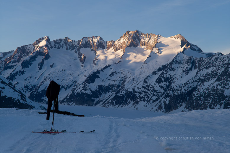 Über ein weiteres Plateau und eine weitere Geländestufe, die ich dieses Mal links umfahre, passiere ich Märjela im Osten – das kleine Hochtälchen auf dem Weg hinunter nach Fiesch. Meine Route verläuft Richtung Westen, eingeklemmt zwischen den Hängen des Eggishorn und den Randspalten des Gletschers. Aufgrund des schneearmen Winters sowie der fortgeschrittenen Jahreszeit erfordert die Wahl des Weges ein wenig Spürsinn und Fantasie. Der Lohn sind ein paar tolle Ansichten. Doch das kleine Labyrinth hat seine Zeit gekostet. Die Uhr zeigt bereits auf fünf Uhr abends. Beim endgültigen Verlassen des Eises stosse ich auf die Originalroute, welche hier von der Gletschermitte her kommt. Schnell sind die Felle auf die Skier aufgezogen. Noch ein Schluck Tee, ein paar Bissen luftgetrockneter Lachs und weiter geht's.