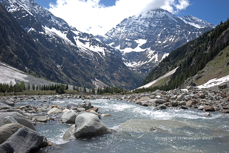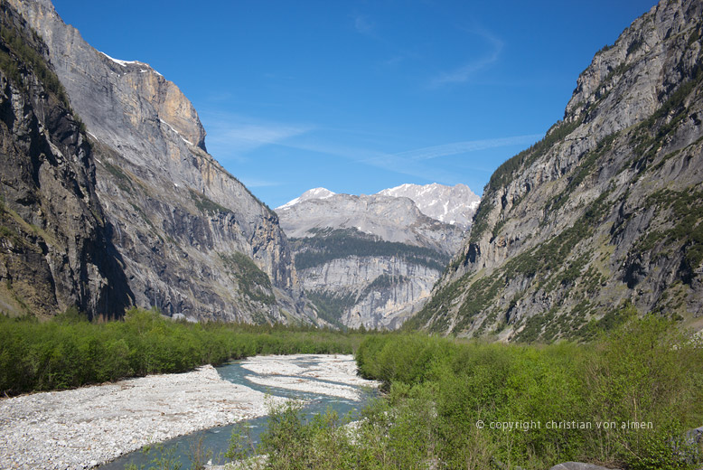 Zur Mittagszeit rastet ich, zuhinterst im Tal, auf dem letzten ebenen Weidflecken. Ein hübscher idyllischer Aussichtspunkt mit einem imposanten Blick entlang den Orgel-Pfeilern hoch zur Doldenhorn, zum winterlich verschneiten Hockenhorn und auf den abschliessenden Talkessel. Es wäre wohl schön auf Skiern, über diesen und den Kanderfirn, den Pass hinüber ins Lauterbrunnental zu überschreiten. Glasklar und eiskalt, als wäre es reines Quellwasser, fliesst die junge Kander talabwärts. Schwer sich vorzustellen, wie aus einem so friedlichen Bergbach ein alles mit sich reissender Strom entstehen kann.