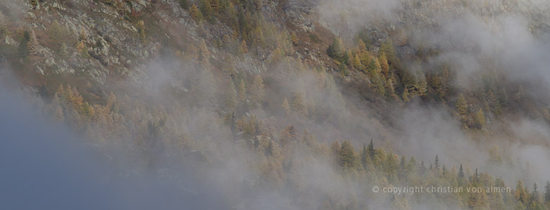 Wer jetzt das Glück hat hier oben zu wandern, dem eröffnet sich eine ruhevolle Welt, weitab von allem Alltagsgeschehen. An manchen Tagen leuchtet der Himmel in einem transzendierenden Blau über Gipfel, Alpweiden und Wäldern. Wie es eben nur im Herbst entsteht, wenn die Luft trocken und kalt ist. Oft liegt am Morgen schon frischer Raureif auf den Bäumen, Stauden, Sträuchern und Matten, manchmal sogar ein wenig Schnee. Doch wer nun bereits den Winter fürchtet oder ersehnt, irrt sich. Noch schlummert im Erdreich ein Rest der Sommerwärme und ich stelle mir vor, wie diese nochmals ihre Kräfte bündelt – zu einem letzten glorreichen Finale.