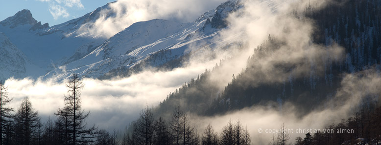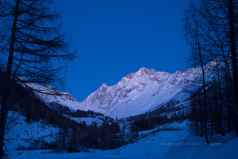 Vom langen Stehen und Schauen friert es mich plötzlich ganz erbärmlich. Höchste Zeit für den Rückweg. Schnell erreiche ich den nahe gelegenen Lärchenwald. Eine kurze geschwinde Abfahrt bringt mich zurück zum Gletscherstafel. Das nun folgende Stockstossen, über den Boden zur Fafleralp hinüber, ist mir sehr willkommen. Durch die energischen Bewegungen kommt mein Blut in Wallung, sodass es wieder warm und angenehm durch meinen Körper pulsiert. Weiter geht’s im Schuss der Strasse entlang, an der Kapelle von Kühmad vorbei, über die Brücke der Lonza. Der Nebel hat sich weit hinunter zurückgezogen. Zwischen den ersten Lärchen des Waldes ob Blatten halte ich nochmals an, werfe einen letzten Blick zurück. Was für eine tolle, ja direkt weihnächtliche Abendstimmung. Doch viel Zeit zum Staunen bleibt mir nicht. In wenigen Minuten fährt unten im Dorf der Postbus. Trotzdem, diese letzte Aufnahme muss einfach sein. In Blatten erwische ich gerade noch den Bus, der mich auf Goppenstein zurück bringt.
