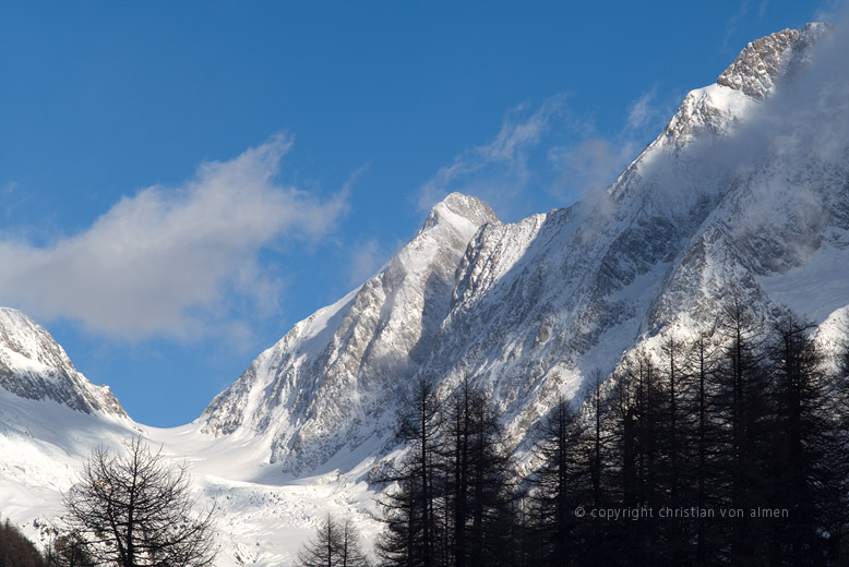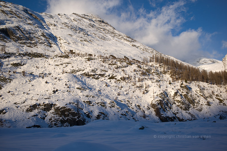 Eine halbe Wegstunde weiter oben gleite ich mit weitausholenden Langlaufschritten am Gletscherstafel vorbei. Dort wo sich der grosse Boden verengt, fliesst die Lonza aus einer engen Felsschlucht hervor. Eine Holzbrücke führt ans gegenüberliegende Ufer. Anschliessend steigt der Weg, der die Strasse abgelöst hat, über eine Geländeschulter bergan, verliert sich in einem lichten Lärchenwald. Nach einer kleinen, flachen Waldlichtung auf der ein Weidbrunnen steht, wird er steiler, schmaler, das Gelände abschüssiger. Unten in der Schlucht rauschen leise die Quellwasser des Bergbaches. Mit jedem gewonnen Höhenmeter hellt sich das diffuse Grau ein wenig mehr auf. Eine Haglücke, gebückt unter den Ästen einer grossen Lärche hindurch, eine enge Kurve und da – da öffnet sich der Blick auf den Talhintergrund. Winterblauer Himmel, ein paar schneeweisse Wolken, Berge überall, im Mittelpunkt die Lötschenlücke! Auf den letzten Metern habe ich mich wie als Zuschauer einer Theateraufführung gefühlt, der da im Saal ungeduldig, neugierig und voller Spannung darauf wartet, dass sich der Vorhang hebe. Um dann, mit dem Blick auf die freie Bühne, alles andere um mich herum zu vergessen.