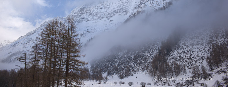 Die letzten Bäume fallen zurück, der Weg quert die Lonza. Ein fahler Lichtschein, so dünkt es mich, mischt sich hier unter die Tristesse. Ein fast unmerklicher Windhauch streift, von vorne her kommend, mein Gesicht. Ein gutes Omen, geht es mir durch den Kopf. Beschwinger ziehe ich meine Spur über den gefrohrenen Schnee auf Kühmatt zu. Hier steht ein wenig überhöht, bergseitig der Strasse, eine schlichte Barockkapelle, der Heiligen Jungfrau Maria gewidmet. Gerade wie ich sie erreiche, reisst der Nebel tatsächlich auf. Über der kleinen Stall-Ansiedelung vis-à-vis, erheben sich himmelhoch Breithorn und Breitlouihorn. Ob das jetzt wirklich nur mit dem Bergwind zu tun hat, frage ich mich? Schnell ist das Stativ aufgestellt, die Kamera festgeschraubt, das passende Objektiv ausgewählt. Für drei Bilder reicht es. Dann senken sich abermals dichte Nebelschleier über die Landschaft.