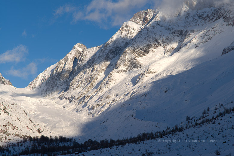 Warm leuchtet das Nachmittagslicht auf den Sonnseiten zu mir in den Schatten herunter. Vor mir liegt, eingebettet zwischen den Bergseiten, die weitläufige flache Ebene des Grunds. In deren Fortsetzung steigt der Langgletscher zu der Lötschenlücke hinauf. Diese bildet den Fluchtpunkt für die beiden Bergketten zu meinen Seiten. Die Lücke! Das verheissungsvolle Zutrittstor zu der schönsten, in sich harmonisch abgeschlossenen Hochalpinen Region der ganzen Alpen – die Heimat der mächtigen Ströme vom Grossen Aletschgletscher, dem Ewig Schneefeld und dem Finsteraargletscher. Doch eben auch das östliche Tor zum Lötschental, dem Tal des Lichtes.
