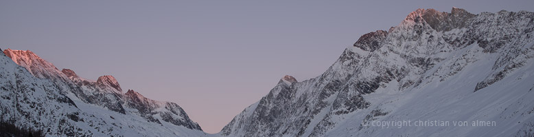 Wie so oft verliert sich die Zeit in dem unendlichen Raum der mich umgebenden Natur. Erst bei einem Blick über meine Schultern realisiere ich, wie der Tag im Tal unten langsam vergeht. Am Hockenhorn oben entflammen rotorange die Gratwolken. Ihr Licht spiegelt sich matt auf der Nebeldecke im Tal wider, verleiht der Ansicht etwas geheimnisvolles, archaisches. Vor mir legt sich das Abendglühen über die Berge, wandert langsam zur Lücke hoch, steigt weiter zu den Himmelsgraten, verweilt für eine kurze Atempause auf den letzten Gipfeln. Zurück bleibt das kühle graublaue Dezemberlicht.