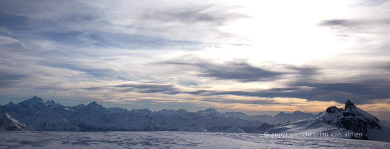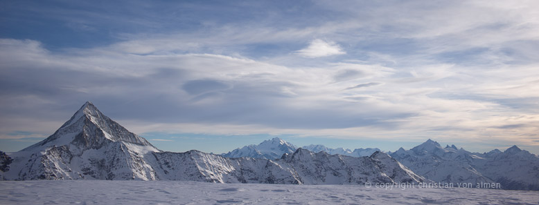 Der Petersgrat, ein weitläufiger, fast ebener Gletscherrücken liegt wie ein Laufsteg zwischen der Blüemlisalpgruppe und der Bietschhornkette. Im Osten erheben sich Tschingel- und Breithorn. Gegen Westen schweift der Blick weit hinüber bis zum Mont Blanc.