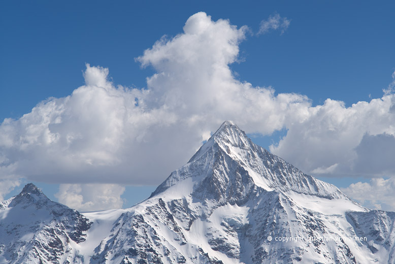 Breit und behäbig ruht der vergletscherte, flache Bergbuckel des Petersgrates vor mir unter der warmen Sonne. Rings um mich herum Licht und Schatten, Wolken, Horizonte, Berge, Gipfel, Grate. Gegen Süden fällt der Gletscher zum Lötschental ab, nördlich zum Gasteretal. Stehe direkt auf der Europäischen Hauptwasserscheide. Von hier fliesst das Wasser der Nordsee sowie dem Mittelmeer zu. Ich schliesse für einen Augenblick die Augen und versuche mir die grossen Flussmündungen von Rhone und Rhein vorzustellen. Wie muss es wohl sein dort zu stehen, wo diese Schmelzwasser in die Meere fliessen? Dort, bei den Gletscher zu verweilen - mit den vielen Erinnerungen an unvergessliche Tage und Touren - von denen das Wasser herkommt? Die Weiten der Meere, mit denjenigen der Gletscher und Gipfeln zu vertauschen?