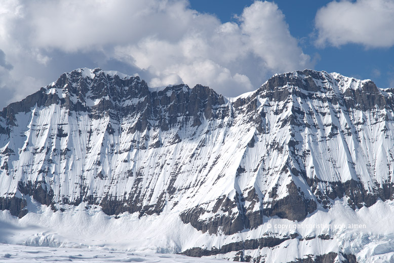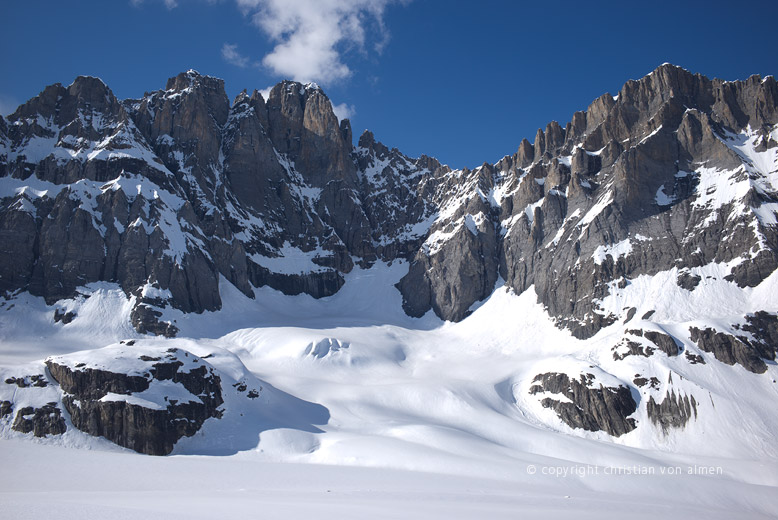 Am Ende des Tschingelgletschers traversiere ich unter der »Nordostwand« der Kanzel durch, welche die Sicht gegen oben versperrt. Da der Schnee nun anspruchsvoller ist, konzentriere ich mich im Steilhang ganz auf das Skifahren. Erst wie das Gelände flacher wird schaue ich wieder umher und erschrecke gewaltig. Wie ein riesiger Koloss überragt mich die mächtige Nordwand des Breithorns. Ehrfürchtig und andächtig halte ich einen kurzen Moment inne.