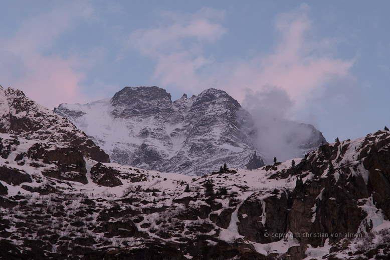 Ich setze mich auf einen ausgeschmolzenen Stein, geniesse hungrig das arg verspätete Mittagessen, folge mit meinem Blick dem, auf den Bergflanken nach oben wandernden, Sonnelicht, betrachte die starke Höhenströmung im Himmel. Berate mich mit mir selber. Wird es noch - quasi als Zugabe - ein Abendrot geben? Der schnelle Wolkenaufzug von Westen spricht dagegen. So setze ich meine Abfahrt fort.