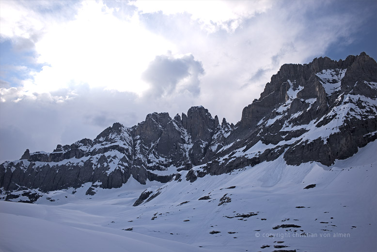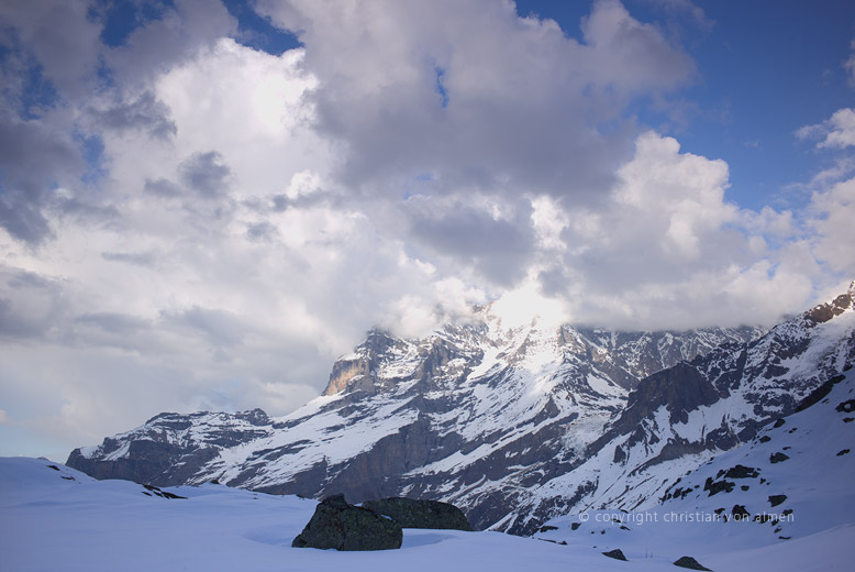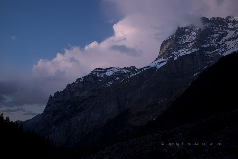Viel zu schnell erreiche ich den Tschingelfirn. Grossartige, ein wenig bedrohliche, brodelnde Wolkenstimmungen über dem Mutthorn und der Blüemlisalpgruppe hinter mir. Darüber die tiefstehende Sonne. Warm leuchten die Felsen der Südwand des Gspaltenhorns im späten Nachmittagslicht. Schön, wie sie sich aus dem makellosen Weiss des Firnfusses in den Abendhimmel hoch steilt. Talauswärts, den Blick eingerahmt vom Südgrat des Tschingelrates, respektive von demjenigen des Nordgrates der Kanzel. Zwischen dem Rahmen die monumentale Kulisse der Nordwände des hinteren Lauterbrunnentals. Ein riesiges, hochalpines Gemälde.