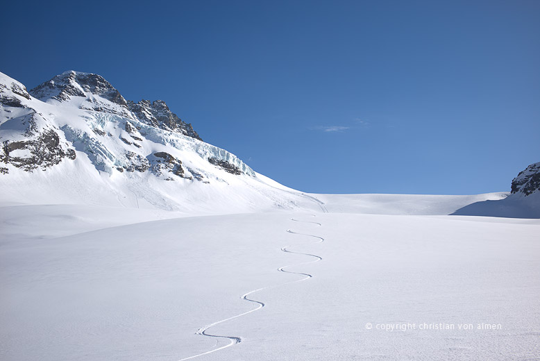 Stehen, staunen, die Landschaft mit allen Sinnen aufnehmen, spüren und erfahren. Felle abziehen, im Rucksack verstauen, ein Schluck Tee, ein letzter Blick hinüber zum Bietschhorn. Mit kräftigen Stockstössen traversiere ich unter den Südwestgrat des Tschingelhorns, folge einer Mulde die sich hinunter zu den ersten, obersten Hängen senkt, male meine Spur in grossen, weitgezogenen Kurven auf die jungfräulichen Schneehänge. Momente der absoluten Leichtigkeit des Seins, sorglos, beinahe schwerelos, ganz im Hier und Jetzt.