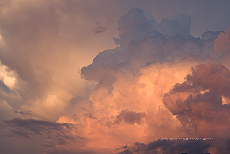 Die Wolken, treue Begleiter auf fast allen meinen Touren, fester Bestandteil vieler meiner Bergfahrten. Bis auf ganz wenige Ausnahmen ist das Landschaftserleben ohne sie für mich eher flach und eintönig. So wie ein grosser, unmöblierter Raum, der durch seine Proportionen, wenn diese denn stimmen, durchaus zu gefallen vermag, mehr jedoch nicht. Steht da drinnen allerdings nur ein passendes „Möbelstück“, ein Kontrastpunkt, so steigt die Spannung augenblicklich. Ebenso verhält es sich mit den Wolken am Himmel als Kontrapunkt zu der Landschaft. Kaum ein Maler, der sich ihrer nicht bedient hätte. Constabel war einer der ersten, der unermüdlich versuchte, die unsteten Wesen einzufangen. Beinahe zwei Jahre lang malte und zeichnete er fast nur Wolken. „Skying“ nannte er es. Dann Turner, der vielleicht bedeutendste Wolkenmaler. Während eines üblen Sturmes auf hoher See, liess er sich an den Schiffsmast binden, um so die wildgewordenen, entfesselten Lüfte, Gischte genauer studieren zu können. Unvergesslich auch, als landschaftlicher Gegensatz zum tosenden Meer, das Gemälde „Hannibal crosses the Alps“